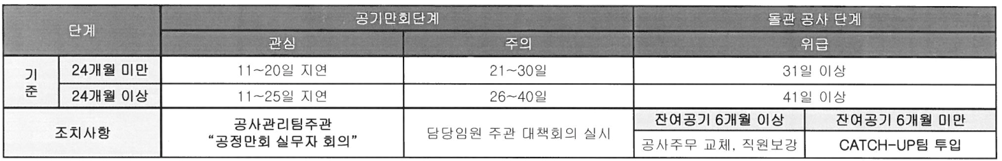 공사 진행이 계획대비 지연되었을 때, 어떻게 납기를 지킬 것인지에 대한 고민과 실행이 필요합니다.