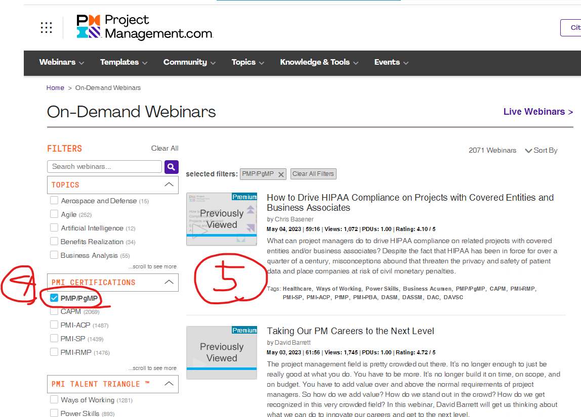 PMI 내 Webinars 에서 제공하는 동영상 강의를 이용하자
