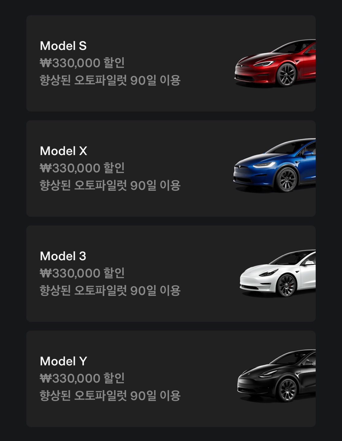 모델 S,3,X,Y 모두 주문시 33만원 할인 + 90일 Advanced Auto Pilot 기능 무료 이용 (구매시 450만원 임)