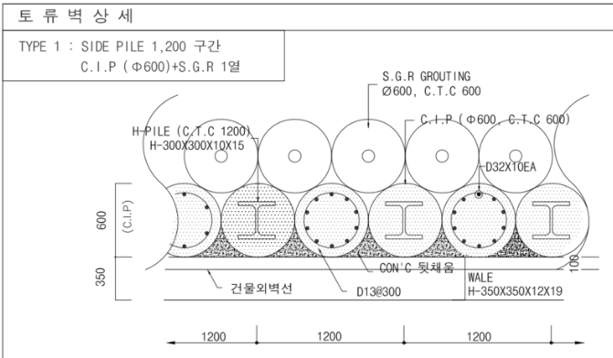 CIP 공법 단일로 쓰는 경우도 있겠지만, 보통의 큰 현장에서는 지하수위가 낮은 구간은 "엄지말뚝+토류판" 흙막이와 병행해서 쓰거나 하는 등 구간별로 복합적으로 쓰는 경우도 많습니다.