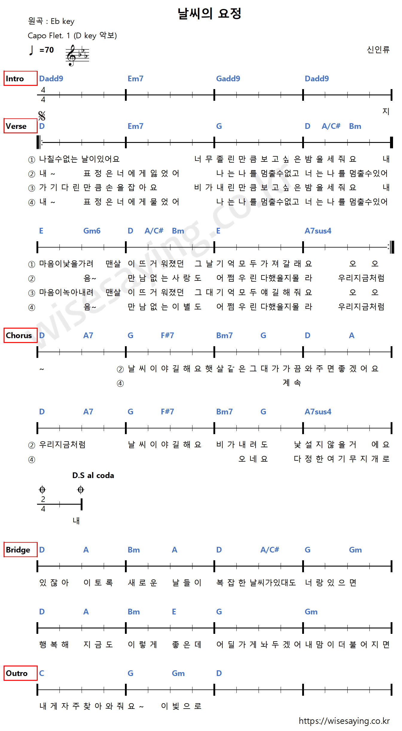 날씨의 요정 남자key 코드 악보 입니다. G키로 연주하면 보통 남자목소리에 무난한데, 너무 낮으면 1~2 Capo 정도로 연주해 보면서 자신의 목소리 키에 맞출 수 있습니다.